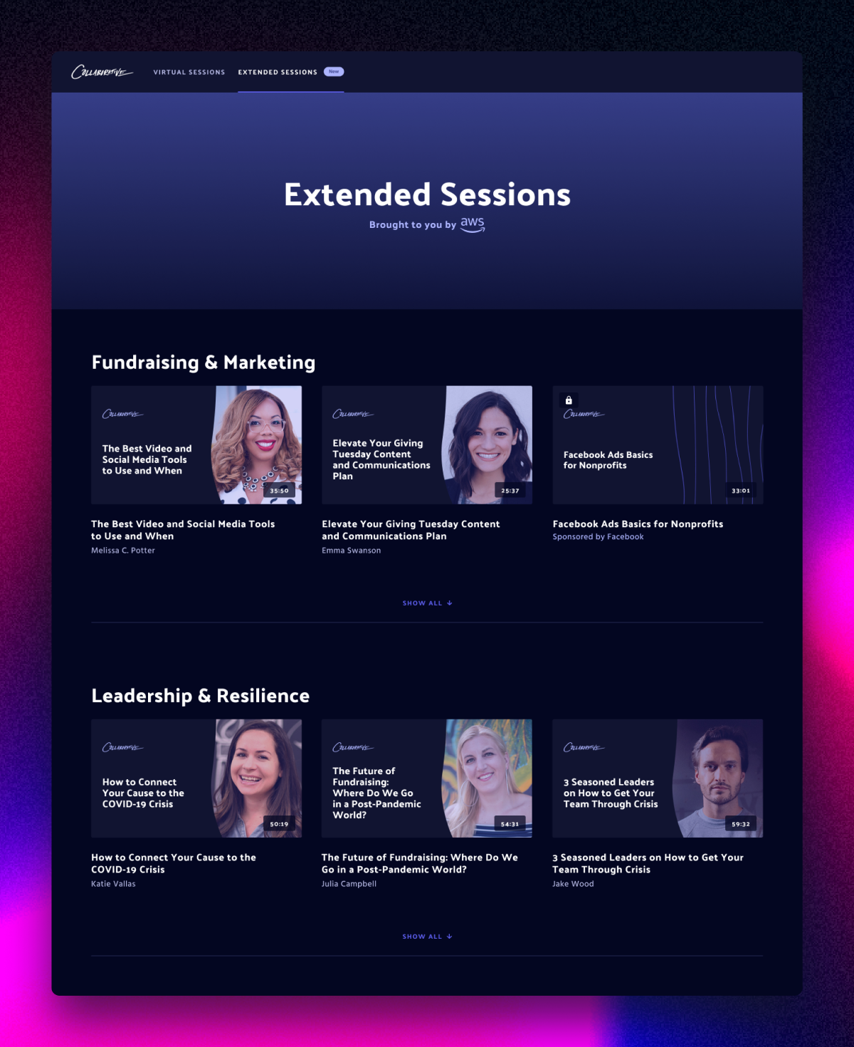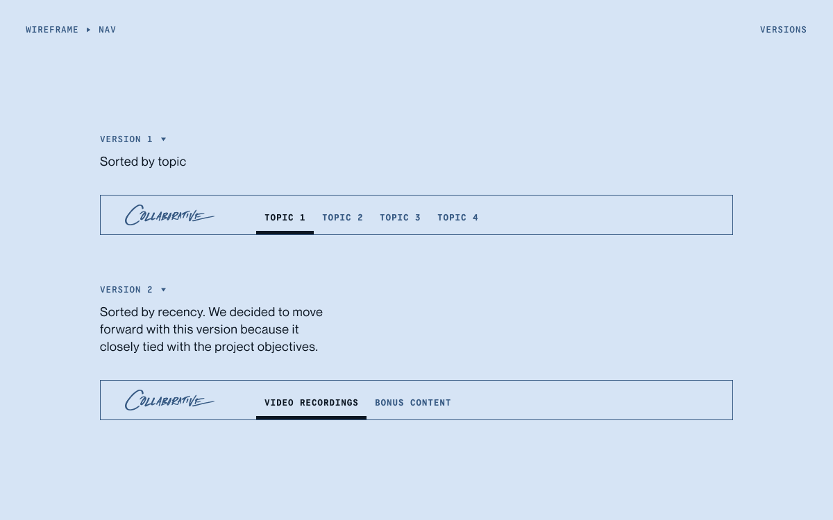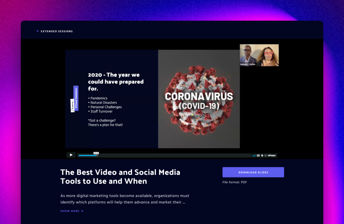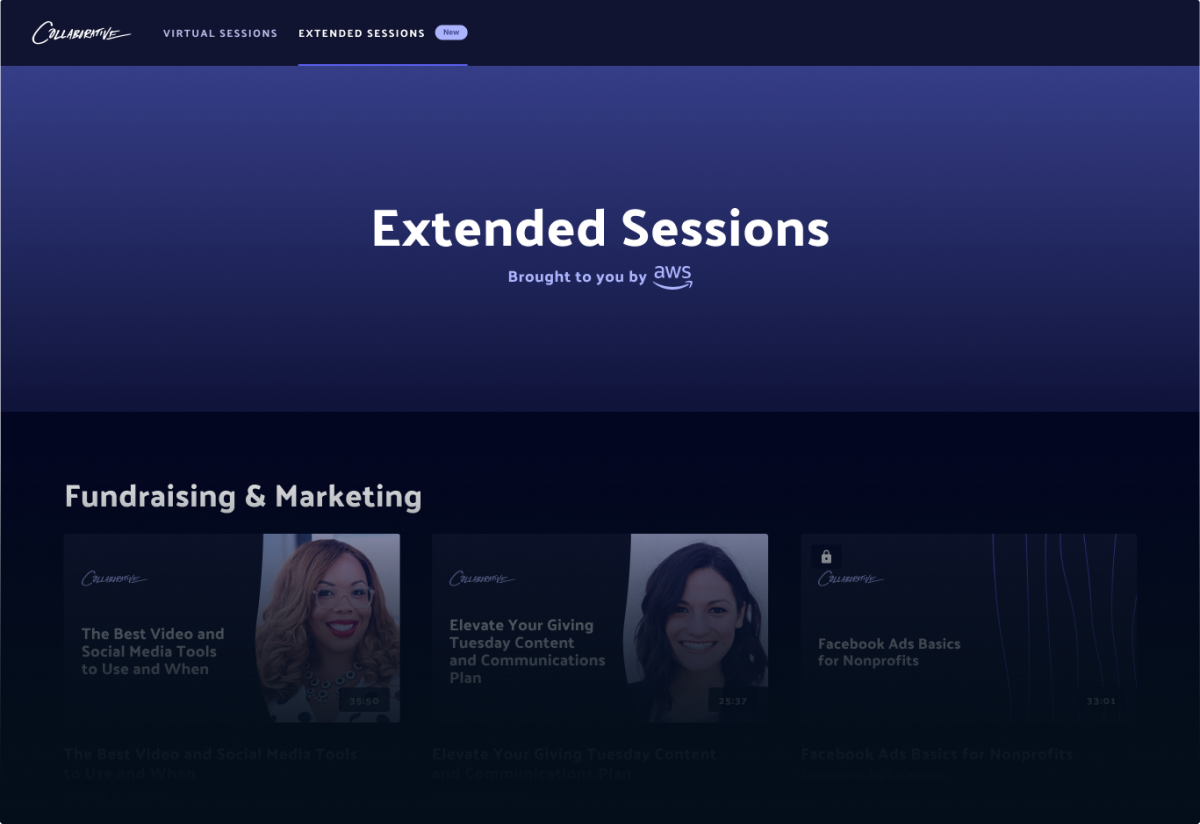 The Collaborative is a conference for nonprofit professionals. Due to the pandemic, the in-person annual event was cancelled. The event organizers quickly shifted to re-launching the conference as a virtual event. In less than a month, I helped the team launch a web experience where attendees could watch recordings of the talks. Attendees could also access exclusive bonus content that were made available post-event.