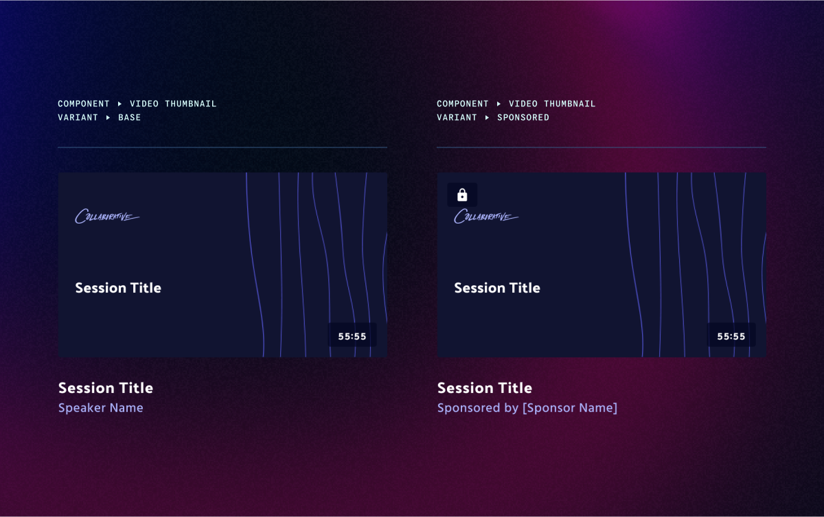 The "sponsored" variant replaces the speaker name with the sponsor name and adds a "lock" icon. Because a gated form adds friction to the user experience, I wanted to mitigate that by using the "lock" icon to signal that extra step in the user flow.