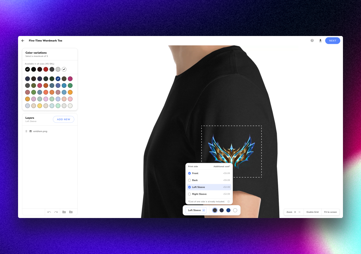 I grouped the print sides with the enabled color variants. With this grouping, creators can now easily find all of the product view/mode controls in the same area.