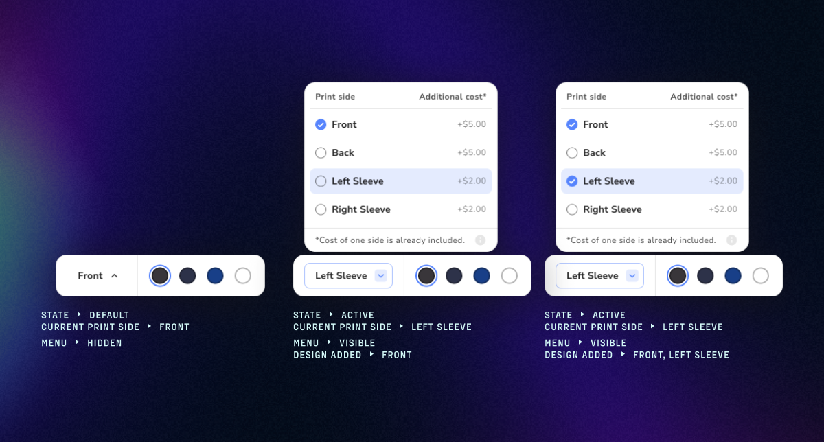 The dropdown component keeps the current print side view visible. The popup menu reveals more information: (1) all available print sides, (2) additional pricing, and (3) an indication if a design was added to a print side.