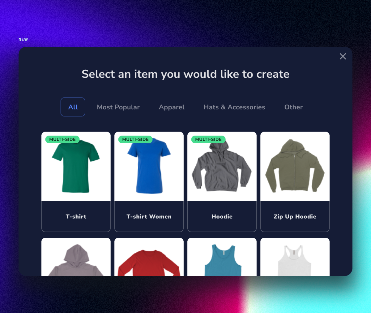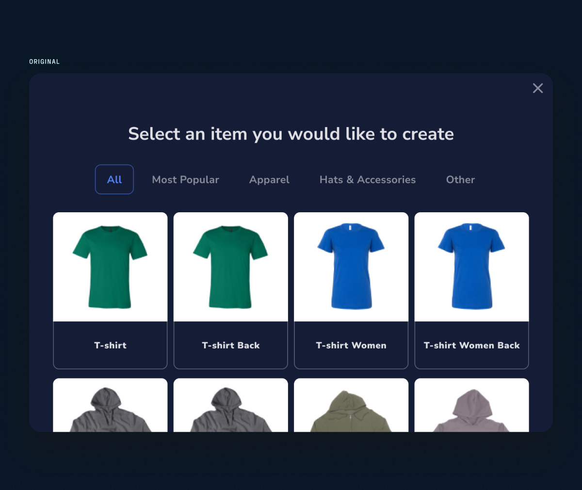 I improved the first step of the merch creation process. The product selector was cleaned up by consolidating multiple listings of a single product (by print side) into a single list item. This helps creators find their product quicker and into the design.