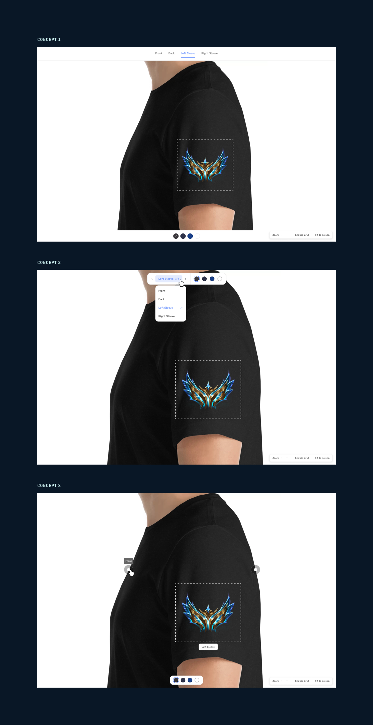 A quick workaround solution was to show the design itself with a label underneath it indicating the print side. To make it dynamic, the background color changes based on the viewer's selected color variant.