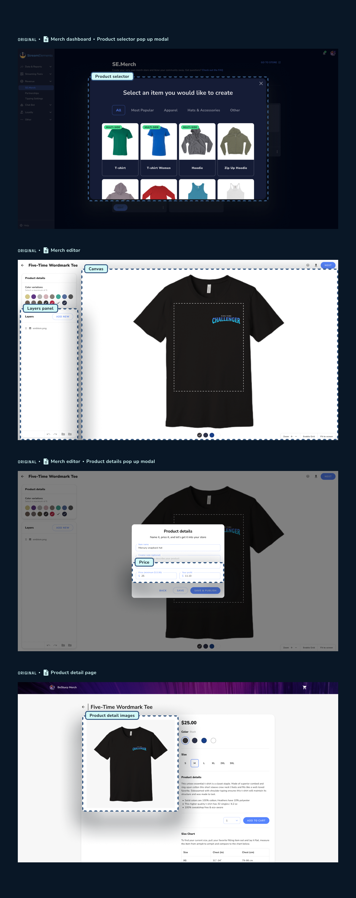 StreamElements is the leading provider of engagement and monetization tools for content creators. The merch product allows creators to design their own merch and customize their storefront. I led the end-to-end design process for the new multi-sided feature across all areas of the merch product: dashboard, editor, and storefront.